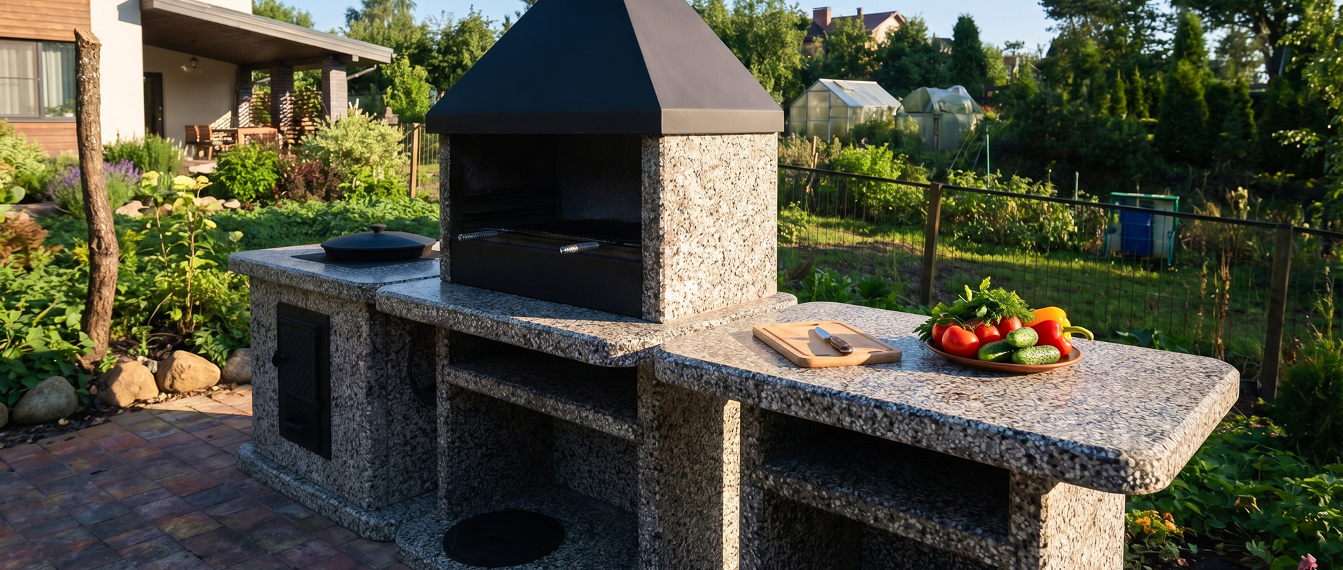 Разделочный стол для уличного гриля — прочность и практичность! Габбро-диабаз и змеевик делают столешницу устойчивой к жиру, огню и влаге.Фактура...