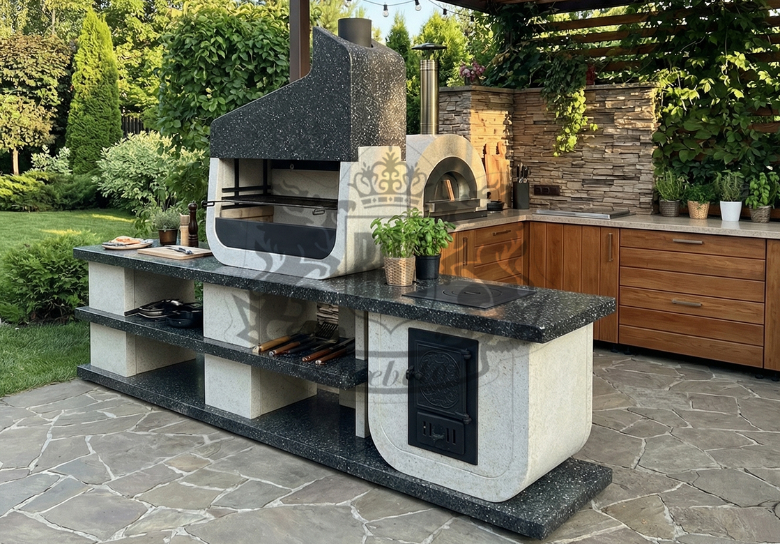 Печи по итальянской технологии воплощают европейский минимализм и хай-тек в уличных грилях для барбекю. Сделаны из натуральной каменной крошки (80%) и жаропрочного бетона М600 (20%), они выдерживают -40°C до +1000°C. Идеальны для дачи, террасы или сада, где стиль сочетается с жарой от мангала.